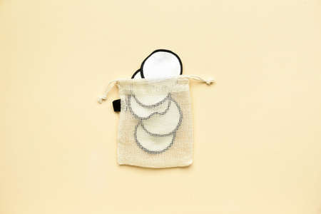 Bag with reusable cotton pads on yellow background
