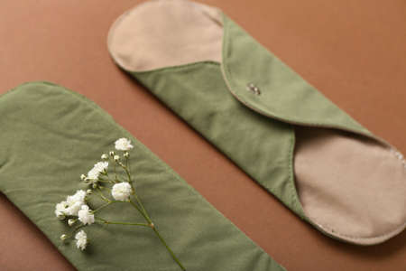 Reusable menstrual pads and flowers on brown background