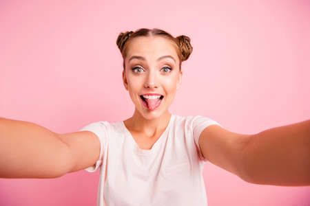 Self-portrait of crazy foolish playful pretty ecstatic cheerful lady