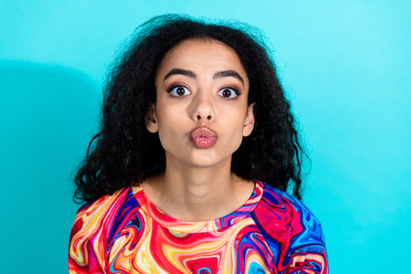Self-portrait of nice sweet lovely lovable magnificent cheerful charming feminine lady sending air kiss video call isolated over turquoise teal green pastel background