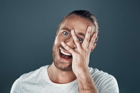 Just for fun. Handsome young man looking at camera and making a face while standing against grey background