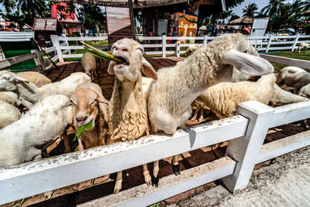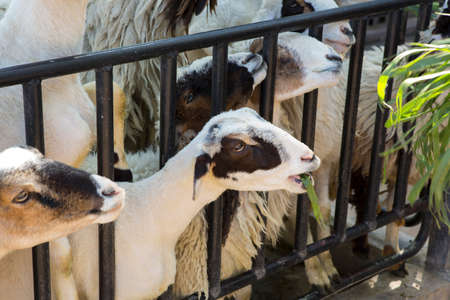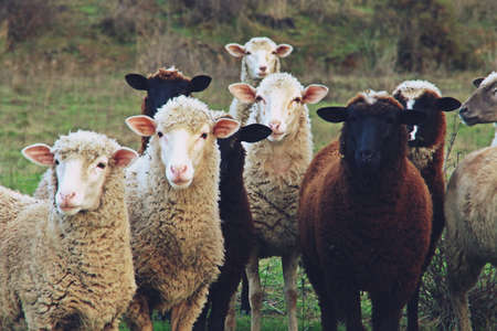 Sheep eat fresh green grass. Pasture of domestic sheep and rams walking on farm. Flock of black white and brown curly haired and shaven sheep graze in pen in village.