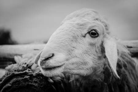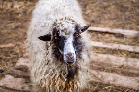 Mountain Carpathian sheep breed. Adult sheep, white with black wool, portrait. Long-haired fleece. Muzzle of sheep.