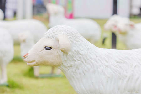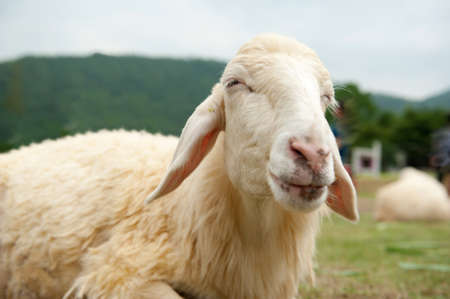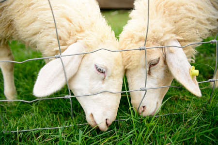 Sheep chewing on grass. Fresh toning. Lamb closeup. Funny cute sheep walk in the pasture. Lambs pose for the camera.