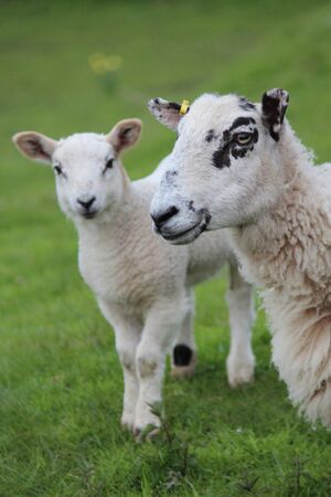 Spring Lambs and Sheep in Green Grassy Meadow, Yorkshire.