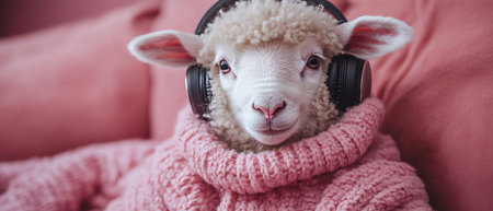 Fluffy sheep wearing headphones, smiling, bright pink background