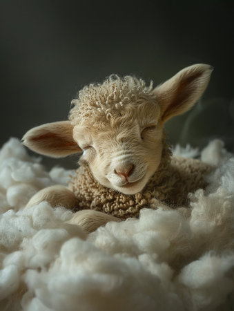 This image features a young lamb, curled up and asleep in a cloud-like setting. The dramatic lighting and detailed textures highlight themes of peace, innocence, and softness, suitable for various creative projects.