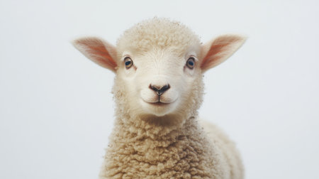 Very cute baby sheep with light brown wool, standing on a white studio background, creating a soft and heartwarming portrait. -
