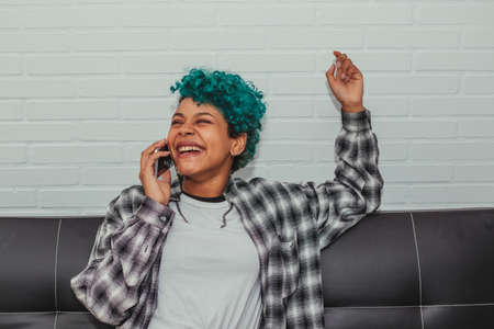 young woman on the sofa at home or office with mobile phone