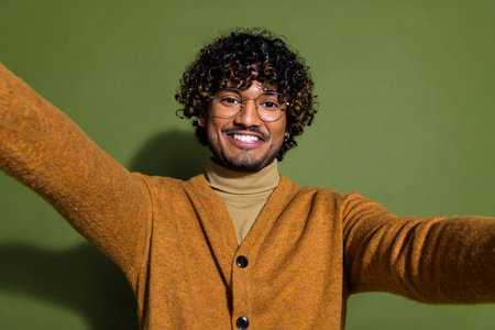 Photo portrait of attractive young man take selfie photo cheerful smile dressed stylish brown clothes isolated on khaki color background