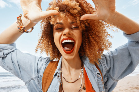 Young woman at beach embracing freedom, enjoying leisure time and happiness outdoors