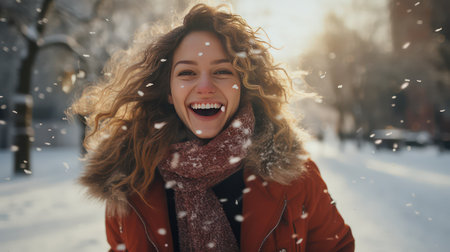 Generative AI : happy girl laughing enjoying life and throws snow at winter outdoors