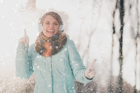 Photo of cheerful happy young lady smile dancer in park snow fall freezing wear headphones outside outdoors