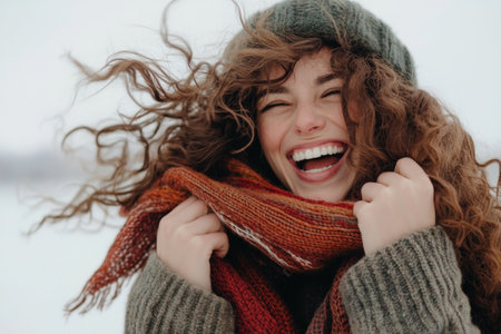 Portrait of a happy woman in warm winter clothes. She is laughing. The wind is blowing the womans hair.
