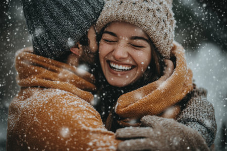 A Couple laughing joyfully in snow, enjoying playful winter moment