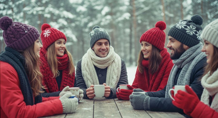 A group of friends sitting around a wooden table in a snowy forest, wearing winter hats and scarves, enjoying hot drinks, smiling and chatting