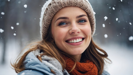 Caucasian young adult woman smiling in winter snow wearing warm hat cozy joyful portrait.