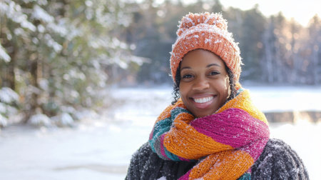 A smiling woman wearing a colorful scarf and hat is standing in the snow. Concept of warmth and happiness despite the cold weather