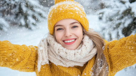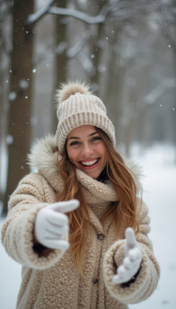 A cheerful young woman stands in a snowy forest, her warm smile radiating joy as she playfully extends her hands towards the camera. Dressed in a cozy beige coat and a matching knitted hat, she embodies the spirit of winter, surrounded by softly falling snowflakes that create a magical atmosphere.