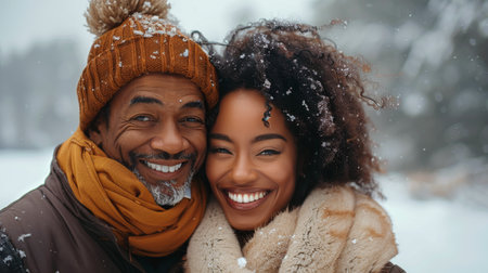 A close-up portrait of a smiling couple in winter, with snow falling around them.