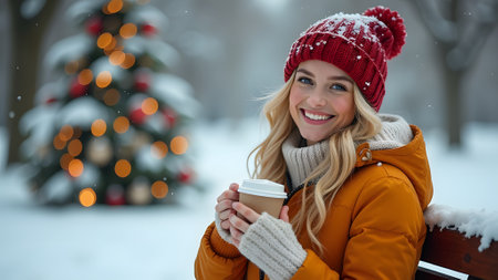 A young woman smiling while holding a coffee cup in a snowy park, wearing a warm hat and scarf, with city buildings blurred in the background