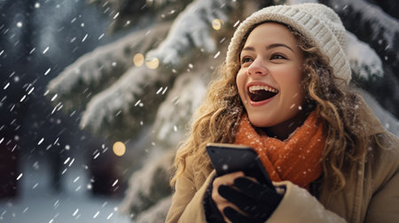 Embrace the holiday spirit in a winter wonderland. This joyful woman takes a selfie and waves happily in the snowy park. Ideal for Christmas season and outdoor activities