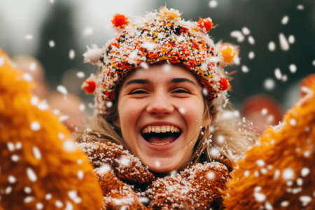 Joyful young woman celebrating winter with a colorful hat, surrounded by falling snow, embodying happiness and warmth in a festive setting