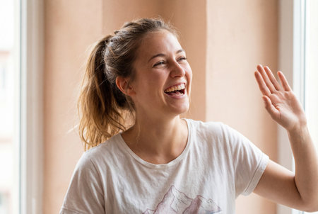 A cheerful young woman wearing a white shirt laughs openly and waves her hand in a friendly gesture while standing in a sunlit room near a large window.