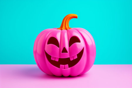 A cheerful pink pumpkin with eyes and teeth on a stylish trendy bright blue pink background. Bright stylish trendy postcard. A fun Halloween concept.