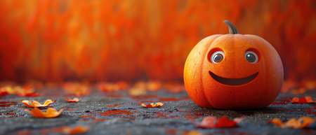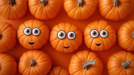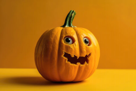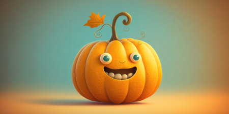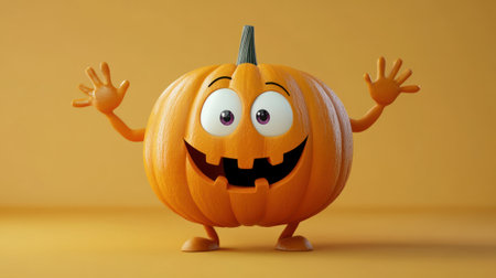 Cartoon pumpkin with big eyes, orange background, joyful and friendly