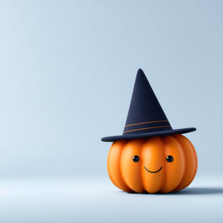 Cute Cartoon Pumpkin with Witch Hat on Blue Background