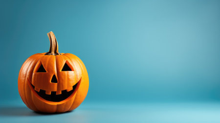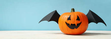 Halloween pumpkin on blue wooden background with copy space for text.