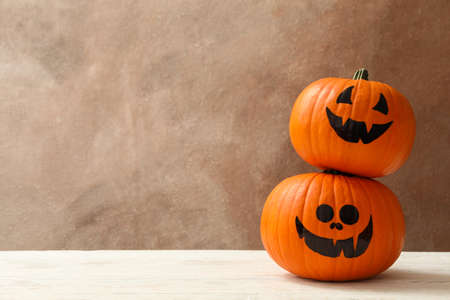 Funny halloween pumpkins against brown background, space for text