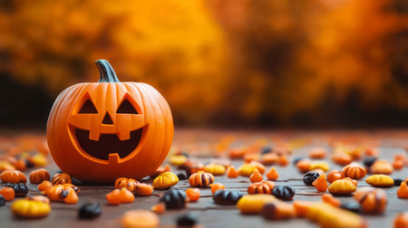 A bright jack-o'-lantern stands on a sidewalk, surrounded by smaller pumpkins and fallen leaves, as colorful lights twinkle in the background.