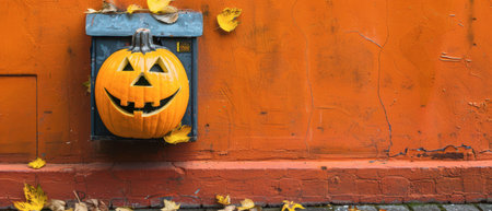 A cheerful, carved pumpkin with a friendly face is placed on a blue mailbox, set against a vibrant orange wall, surrounded by fallen yellow leaves in the autumn season.