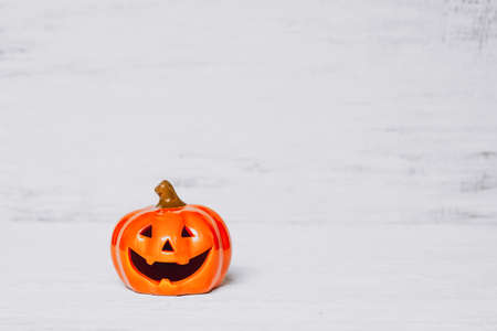 Smiling ceramic pumpkin lantern on a blue background. Happy Halloween or Thanksgiving concept