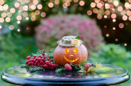 A funny Halloween pumpkin with glowing eyes and a toothy smile is sitting on a garden table. Selective focus