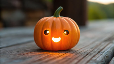 A cheerful orange pumpkin with a carved smiling face sits on a rustic wooden table against a neutral background perfect for Halloween.