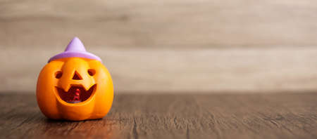 The pumpkin jack o lantern on wood for halloween content.