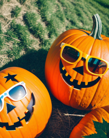 Halloween pumpkins with funny faces and sunglasses. Outdoor shot.