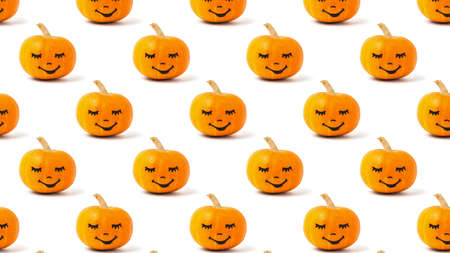 Seamless pattern of pumpkins with faces on a white background. Halloween party.