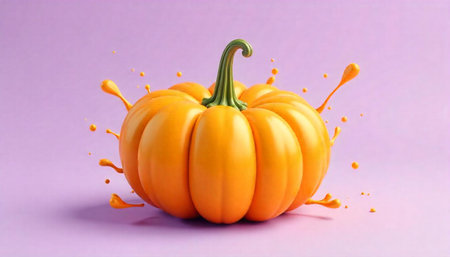 Vibrant orange pumpkin with juice splash on lilac backdrop