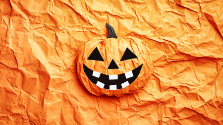 A cheerful jack o' lantern sits prominently on vibrant orange crumpled paper, embodying the festive essence of Halloween with its playful smile and expressive features.
