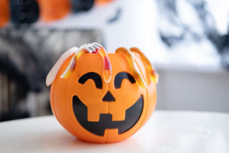Plastic jack o lantern with marmalade on white table on halloween decorated background