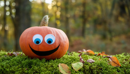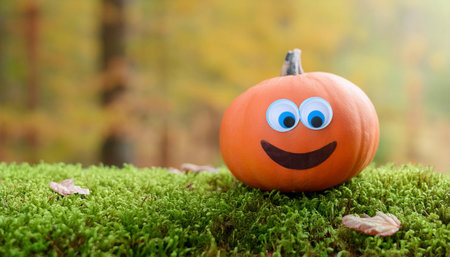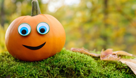 A single pumpkin with a painted smiley face and large googly eyes rests on a bed of green moss in front of a blurred background of autumn foliage. The pumpkin is bright orange and the background is a muted yellow.