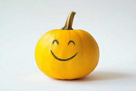 Yellow pumpkin with a hand drawn smiling face expressing happiness, placed on a clean white background