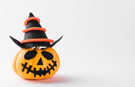 Funny Halloween day party concept ghost pumpkin head jack lantern scary smile wear hat, studio shot isolated on white background, Holiday decoration