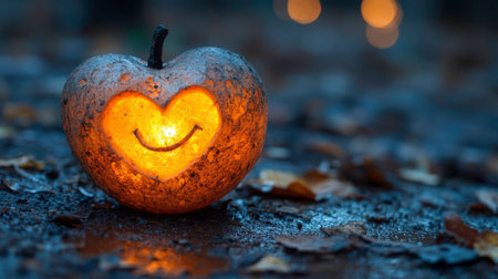 This photo captures a heart-shaped apple lantern, with a carved heart and smiley face, glowing warmly on a wet ground scattered with fallen leaves. The image evokes a sense of autumn festivity, warmth, and whimsical charm. The soft light from the lantern contrasts with the dark, blurred background, creating a cozy and magical atmosphere.
