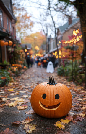 Pumpkin carved like a ghost in front of decorated houses, autumn leaves and trees