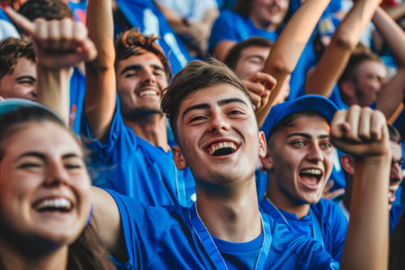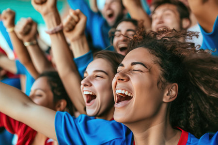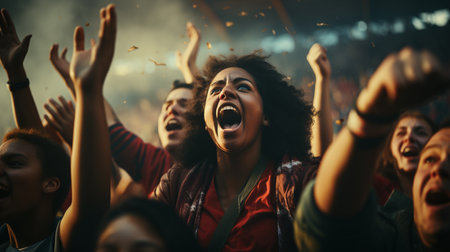 A diverse group of individuals standing together, raising their hands in a show of support and unity, A group of fans cheering and chanting in support of their team